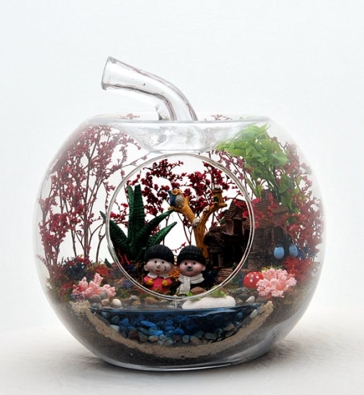 Tasarım içerisinde 1 adet yapay kaktüs bitki bulunmaktadır. 1 adet taş ev, 1adet 1adet yaşlı çift ,1adet baykuşlu ağaç,1adet sokak lambası ,1adet mini kaplumbağalar şoklanmış yosunlar ve kurutulmuş bitkilerle dekore edilmiştir. Elma fanus boyutu: yükseklik 23 cm, çap: 25 cm'dir. Not: Kullanılan cam, üfleme cam olduğu için, her bir cam kendine özeldir ve farklılıklar gözlenebilir. Ürünün yapımı esnasında sap kısmının kesim noktası eğimli bir görüntüye sahiptir, kırık değildir.