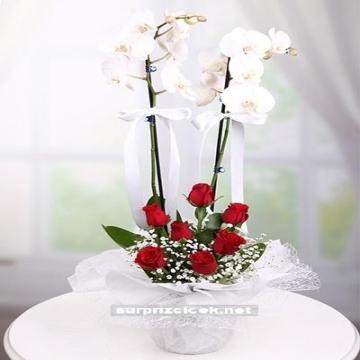 Çift dallı bir orkide ve kırmızı güllerden hazırlanan aranjman ile, sevdiklerinize güzel bir armağan yollayın.