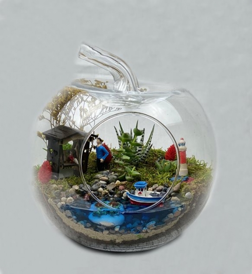 Teraryum dayanıklılığı yüksek ve bakımı kolay bitki türlerleri kullanılmıştır. İçerisinde 3 adet ithal canlı bitki bulunmaktadır. Şoklanmış yosunlar ile dekore edilmiştir. Teraryumun bakımı kolaydır ve çok fazla sulamaya ihtiyaç duymadan uzun süre yaşayabilirler. İç mekan için uygundur. Aydınlık bir ortam sağlanmalı, güneş ışığı almalı ancak direkt güneşe maruz kalmamalıdır. Toprağının nem seviyesine göre su püskürtülerek sulanmalıdır. Özel olarak hazırlanan modelimiz, salıncak ,fener, tekne ve insan figürlerinden oluşmaktadır .Hafta bir su olarak çalışılmaktadır. Orta boy elma cam fanus boyutu: 26 cm x 33 cm Not: Kullanılan cam,üfleme cam olduğu için , her bir cam kendine özeldir ve farklılıklar gözenebilir .Ürün yapımı esnasında sap kısmının kesim noktası eğimli bir görüntüye sahiptir, kırık değildir.