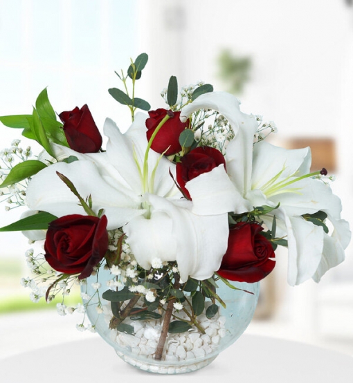 Hayır demesi zor iki farklı tür; beyaz lilyum ve kırmızı gülleri bir araya getiren ve aranjmanı zenginleştiren dekoratif malzemesi ile ilk bakışta kendisine hayran bırakan akvaryum cam içinde hazırlanmış şık ve zarif sunum. Not: Lilyumlar, mevsimsel şartlar nedeniyle kapalı olarak gönderilebilir. Kapalı lilyumlar oda sıcaklığında ve 1-2 gün içerisinde açmaktadır.