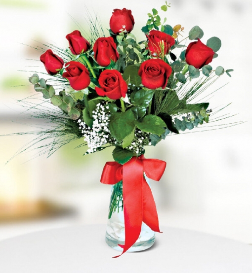 Bir ev düşünün; turuncu çatısı beyaz panjurları ve bahçesinde illa ki kırmızı gülleri olan... Çiçek denilince ilk akla gelen ve vazgeçilmezlerden olan kırmızı gülün 9 adetinin, yeşillik ve cipsofilyalarla bir araya getirildiği vazo içerisindeki sunumuyla dikkat çeken aranjman. Not: Güllerin renk tonları ve boyutları mevsim şartlarına göre değişkenlik gösterebilir.