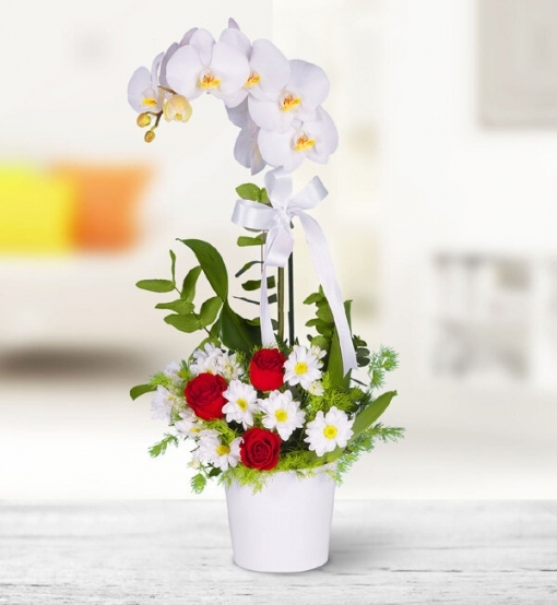 Klişelerden hoşlanmayan, sıradan ve birbirinin tekrarı hediyelerden sıkılanlara özel sıradışı bir orkide tasarladık. Orkidenin zarafeti gül ve papatyanın cazibesiyle buluştu. Not; Orkideler, mevsim şartları ve ürünün yapısı gereği çiçek ya da tomurcuk adetlerinde değişkenlik gösterebilir. Papatyaların yapısı gereği aranjmandaki çiçek adedine tomurcuklar da dahildir.