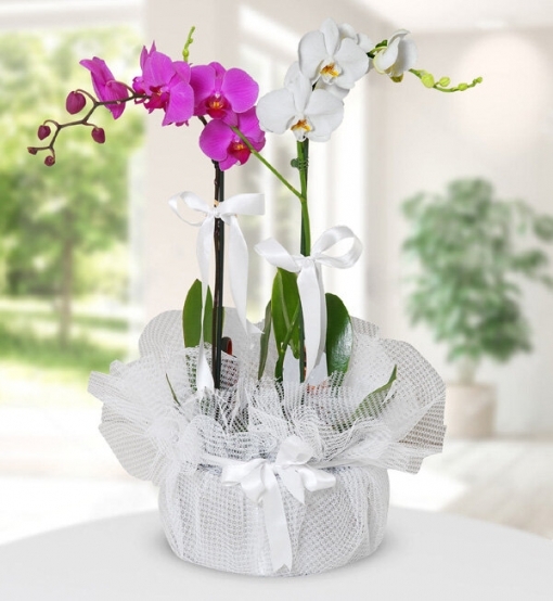 Mor ve Beyaz Orkide Saksı içerisinde 60 cm yüksekliğinde mor orkide ve beyaz orkide ile hazırlanmıştır