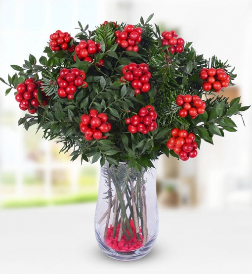 Yılbaşı Çiçeği Kokinalar Şık silindir cam vazo içerisinde kokina çiçeği ve yeşillikler ile hazırlanmıştır
