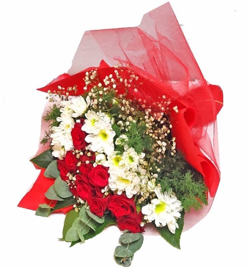 Tüller İçerisinde 9 Kırmızı Gül ve Papatya