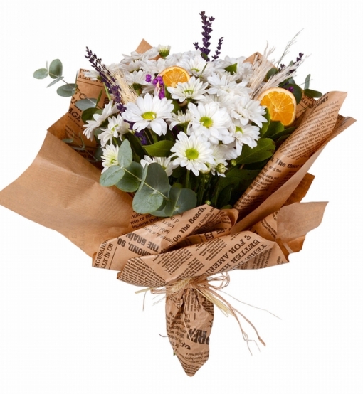 Buketimizde özenle seçilmiş taze papatyalar kullanılmaktadır. Buketin yaklaşık yüksekliği 40-50 cm boyutlarındadır.