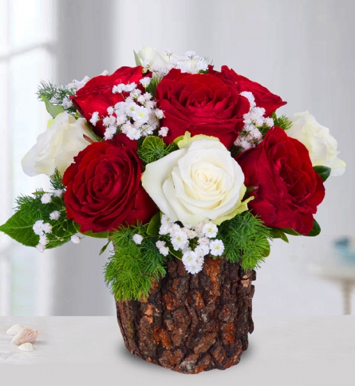 Doğal Kütükte Aşkın Simgesi Kırmızı Beyaz Gül Aranjmanı