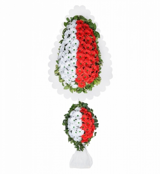 Tasarım kırmızı ve beyaz yapay gerberalar ile hazırlanmış açılış ve düğün çelengi.