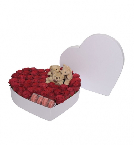 Beyaz kalp kutu içerisinde kırmızı güller, makaronlar ve mini ayıcıklar ile hazırlanmıştır.
