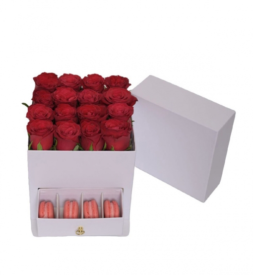 Eşsiz tasarım beyaz kutusu ile Butik Kırmızı Güller Makaronlar aranjmanı, taze kırmızı güllerden ve lezzetli taze makaronlardan oluşur. Aranjman yaklaşık olarak 16x18 cm boyutlarındadır.