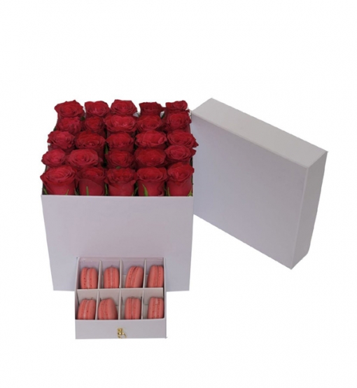 Beyaz kutu içerisinde kırmızı güller ve makaronlar ile hazırlanmıştır