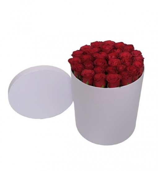 Beyaz silindir kutu içerisinde kırmızı güller ile hazırlanmıştır.