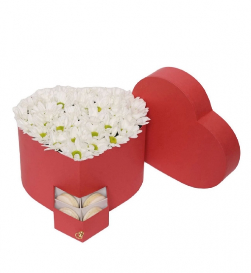 Sevginizi en özel şekilde ifade etmek için tasarlanmış bu hediye seti, 40 adet taze beyaz papatya ve 4 adet lezzetli makaron ile hazırlanmıştır. Çekmeceli kırmızı kalp kutu içinde sunulan bu zarif aranjman, duygularınızı en tatlı haliyle sevdiklerinize iletmek için ideal bir seçenektir.