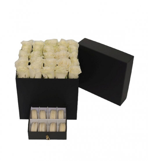 Zarafeti, sadeliği ve tatlılığı bir araya getiren bu özel tasarım kutuda; 25 adet taze beyaz gül ve 8 adet özenle hazırlanmış makaron yer alıyor. Siyah çekmeceli lüks kutu içinde sunulan bu hediye, özellikle şık ve anlamlı sürprizler yapmak isteyenler için ideal.