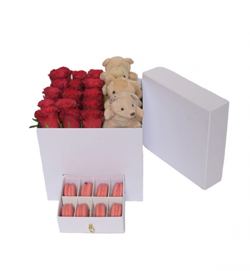 Aşkınızı en tatlı şekilde ifade edin! 15 adet taze kırmızı gül, 8 adet özenle hazırlanmış makaron ve 4 mini peluş ayıcık, şık çekmeceli beyaz kutuda bir araya geldi. Bu zarif hediye kutusu, sevgilinizin kalbini çalacak en güzel sürprizlerden biri.