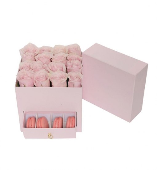 Çekmeceli Pembe Kutu İçinde 16 Pembe Gül ve 4 Lezzetli Makaron