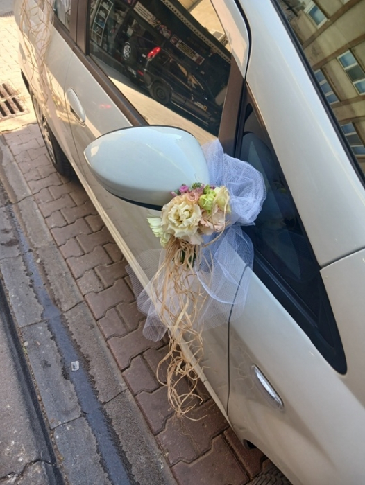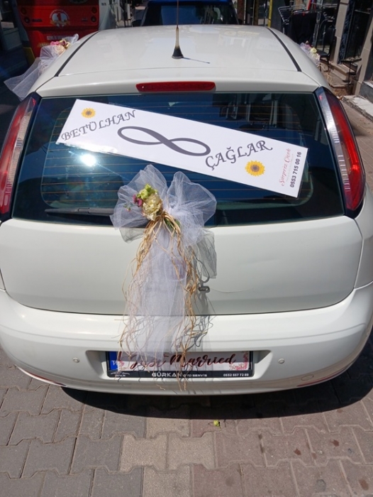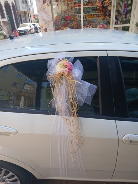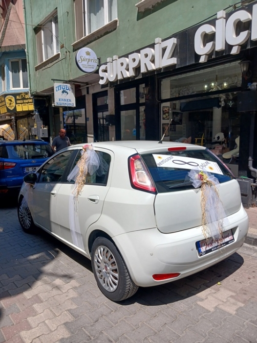 "Beyaz Fiat gelin arabası süslemesi – Zarif beyaz tüller, saman detayları ve turuncu lilyum, pembe gül ve beyaz gerbera çiçekleriyle hazırlanmış şık bir düğün arabası dekorasyonu. Gelin damat arabası süsleme fikirleri arayanlar için modern ve doğal bir tasarım."