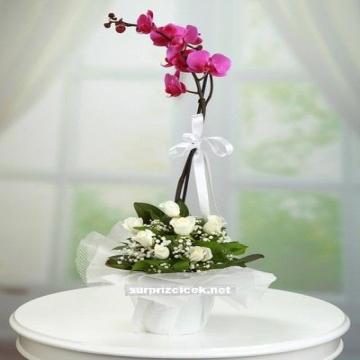 Vazgeçilmez olan sevginize yakışır bir çiçek , mor orkide ve beyaz güller ,sevdikleriniz için harika bir sunum olacak.