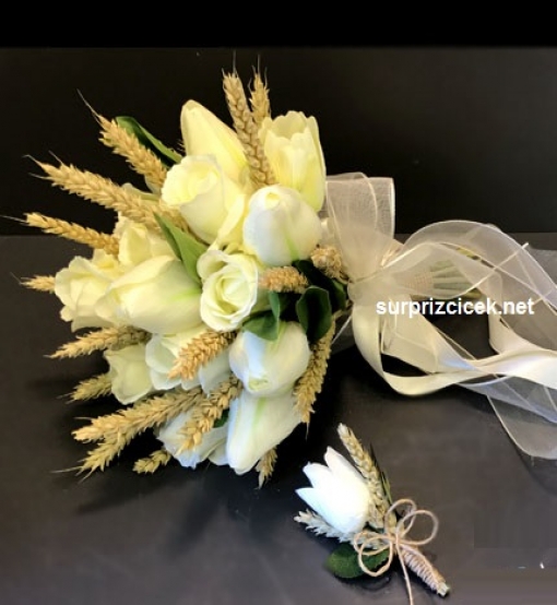 Yapay lale ve güllerden hazırlanan gelin buketimiz, bereketin simgesi başaklarla hareketlendirildi. Gelin kızlarımızın en çok tercih ettiği ekru tonlarında hazırlanan el buketi ile en özel gününüz daha da taçlanacaktır. Yapay gelin buketi ile uzun yıllar evinizde anı alarak saklanabilecek anılar biriktirebilirsiniz. Gelinlerin rüyalarını süsleyen güzellikteki gelinlikle bütünleşecek olan yapay laleli gelin buketini tek tıkla sipariş verebilirsiniz.