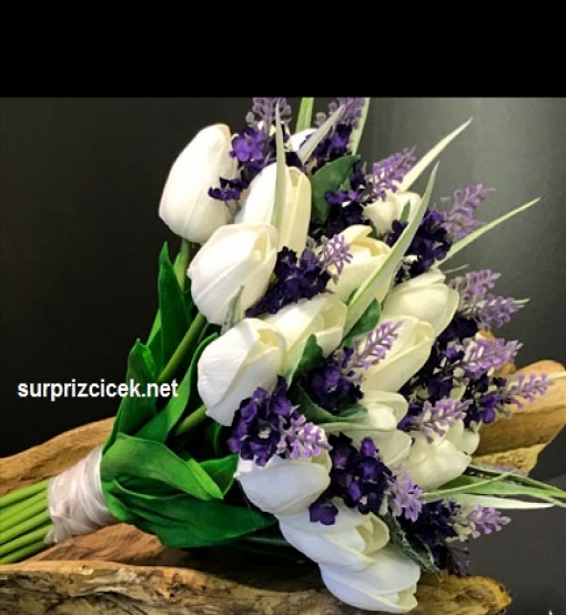 Genç kızların hayallerini süsleyen düğün törenlerinin en önemli detaylarından olan gelin el buketi, şık görünümleri, dışında kalıcı bir hatıra olarak yıllarca saklanabiliyor. Bu amaçla gerçeğinden ayırt edilemeyen doğala en yakın yapay çiçeklerden gelin çiçekleri hazırladık. Lale gelin buketi ekru, beyaz gelinliklerle şık bir uyum içerisinde fotoğraf karelerini süsleyecektir. Bu yılın popüler rengi mor renkte lavanta çiçekleri ile hazırlanan gelin çiçeğimizle uyumlu arzuya göre damat yaka çiçeği de sipariş edebilirsiniz. Hayatınızın en anlamlı gününde lale el buketi ile evet demek isterseniz siparişinizi birkaç gün önceden vermeniz yeterli...