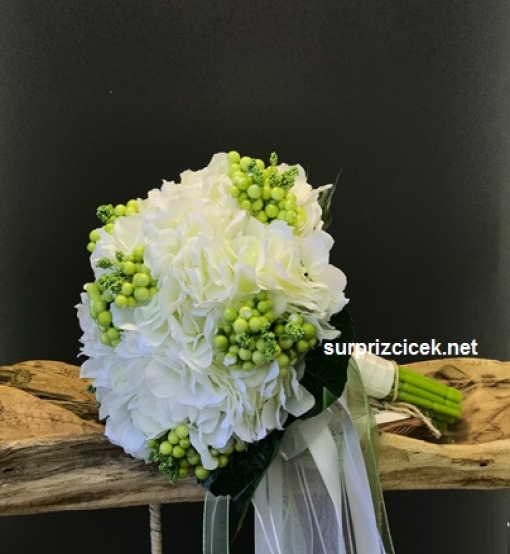 Yapay beyaz ortancalar, aralarda yeşil garnütürler kullanarak hazırladığımız yapay gelin buketi ile düğün karelerinde yanınızdayız. En şık gelin olarak yıllarca hafızalardan silinmeyecek görselin tamamlayıcısı yapay gelin buket modelimiz asil ve sade görünümü ile en çok tercih edilen modellerimizden. Beyaz ve yeşilin uyumlu görünümü ile gelinliğin güzelliğini ortaya çıkaracak olan el çiçeği modelimizi hemen sipariş verin adresinize kadar gönderelim.