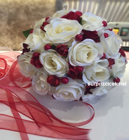 Krem rengi güller ve aralarda bordo garnütürler kullanarak hazırladığımız yapay gelin çiçeği