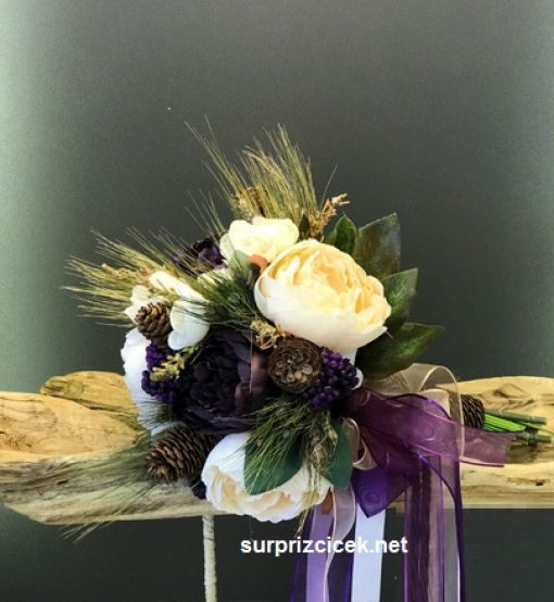 Krem ve patlıcan moru tonlarında şakayık, minyatür kozalaklar, garnİtürler ile hazırlanmış yapay gelin çiçeği modelimiz ile gelinliğin şıklığını tamamlayın. Yılın en popüler rengi mor ve uyumlu renklerde hazırlanan gelin el çiçeği natürel görünümü ile şıklığınızı arttıracak. Düğünün en güzel karelerinde elin çiçeğinizin ışıltısını yıllarca görmek isterseniz klas gelin çiçeğimizi hemen sipariş edebilirsiniz. Gelin el çiçeği siparişlerinizi ister netten, isterseniz de cepten iletebilirsiniz.