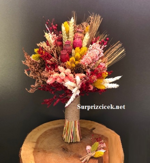 Kuru buğday, minyatür kozalak, başak ve ara garnürlerle hazırladığımız gelin buketi ile hayatıınızın en anlamlı gününde yanınızda olacağız. Yılın modası kurutulmuş çiçeklerle hazırlanan gelin el çiçeğimiz ile gelinliğin güzelliğini tamamlayabilirsiniz. Her zaman anısını evinizde yaşatacağınız gelin el buketinizi tek tıkla internetten sipariş verdiğinizde adresinize kadar gönderiyoruz. Bursa dışına da kargo ile 1-3 iş günü içerisinde elinizde olacak şekilde yapay gelin çiçeği modellerinizi gönderiyoruz. Kuru Çiçeklerden Gelin Buketi