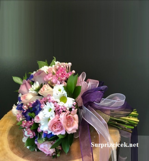 Rengarenk taze ve capcanlı çiçeklerden hazırlanan Özgün modellerimizi sizlerin beğeninize sunuyoruz. şıklığınızın tamamlayıcısı olacaktır. pembe güller, beyaz krizantem, bovardia çiçekleri yer alıyor. Pembe, beyaz, mor kurdelalarla süslenen çiçeğimizi tek tıkla internetten veya telefonla sipariş verebilirsiniz.