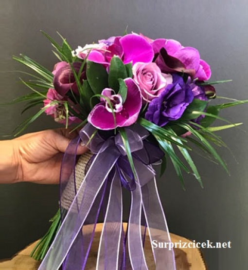 Gelin çiçeği canlı olsun, güzel olsun ve albenili olsun diyorsanız işte size nadide orkide çiçekleri ile hazırladığımız modelimiz. Canlı mor orkidelere eşlik eden gül, lisyantus, gala ve lisyantusların uyumlu buluşması ile ortaya çıkan el buketi morlu kurdelalarla zenginleştirildi. Mor, fuşya tonlarında çiçeklerden oluşan canlı gelin çiçeğini sipariş etmek için tek tık yeterli. Siparişlerinizi en hızlı ve güvenilir bir şekilde adresinize ulaştırıyoruz
