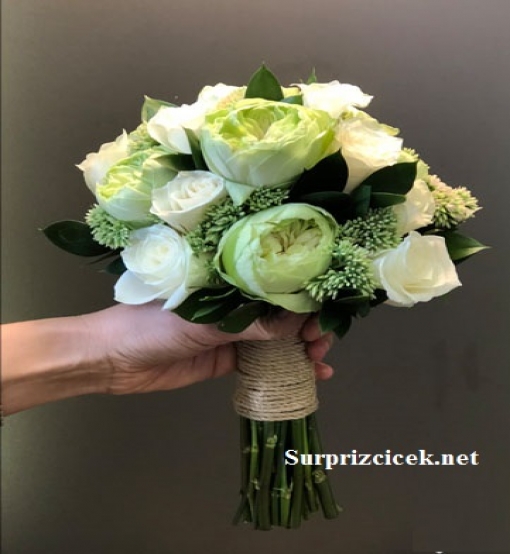 Canlı ve taze şakayık güllerle hazırladığımız gelin el çiçeği modelimiz. Gelin buketleri ile özdeşleşen şakayık güllerin sade ve zarif görünümü ile düğün gününde gözler üzerinizde olacak. Şakayık güller ithal güller ve ara garnitürlerle hazırlanan el buketinin sap kısmında natürel halat kullanıldı. Buketinizle uygun çiçeklerle hazırladığımız damat yaka çiçeğini de hediye olarak sunuyoruz. Hayatın en anlamlı gününde canlı çiçeklerle hazırlanan albenili el buketine sahip olmak isterseniz tek tıkla siparişinizi iletebilirsiniz.