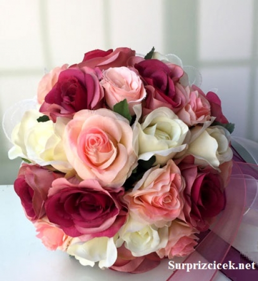 Yapay fuşya, pembe, beyaz güllerden oluşan organze tül ve kurdeleler ile zenginleştirilen yapay gelin çiçeği