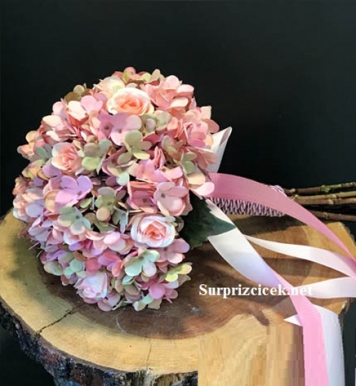 Açıklı koyulu pembe tonlarında yapay ortancalarla hazırladığımız gelin el buketi modelimiz. Sade olduğu kadar şık görünümü olan gelin el buketi ile düğün gününde tüm gözler üzerinizde olacaktır. Pembe gelin el buketi düğün öncesinde veya sonrasında fotoğraf çekimi için de kullanılacağı için ekonomik bir seçim olacaktır. Salonda bir vazo içerisinde yıllarca konumlandırabileceğiniz buket modelimizi tek tıkla internetten veya telefonla sipariş oluşturabilirsiniz.