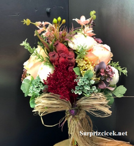 Gelinliğin ihtişamını tamamlayacak en özel aksesuarlardan olan gelin çiçeği modellerinde sınırsız seçeneklerimiz bulunuyor. Soft renklerde canlısından ayırt edilemeyecek kadar doğal görünümlü yapay çiçeklerden hazırlanan özgün modeldeki gelin çiçeğimiz içerisinde kuru çiçekler de yer alıyor. Aynı tonlarda damat yaka çiçeği hediyesi ile sunduğumuz gelin el buketi için sadece bir tıkla sipariş oluşturabilirsiniz. Gelin el çiçeği siparişlerinizi netten veya telefonla iletin;çiçeğinizi adresinize teslim edelim.