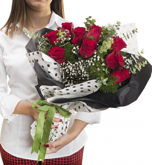 Puantiyeli buketlik kağıt ve Siyah buketlik kağıda sarılı 9 adet Kırmızı Gül ile sevdiklerinize sürpriz yapmaya ne dersiniz?