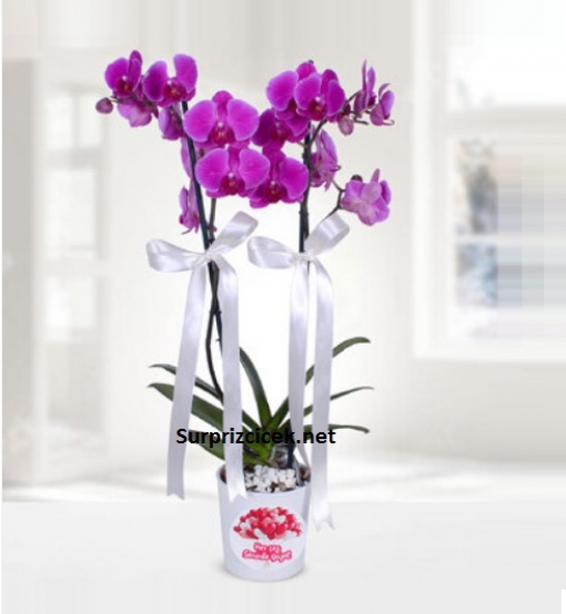 Her şey seninle güzel temalı seramik vazo içerisinde çift dallı mor orkide ile hazırlanmıştır.