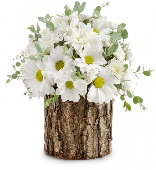 İşlenmemiş dekoratif kütükte düzenlenmiş beyaz papatyalar ile sevdiklerinizi mutlu edebilirsiniz.
