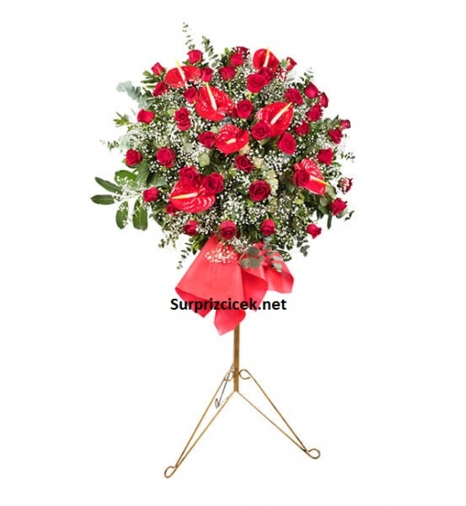 "Renklerin en asillerden olan kırmızının vazgeçilmez asaletini, 41 kırmızı gül ve 7 kırmızı antoryum ile sunan Kırmızı Antoryum Ferforje Çiçek Aranjmanı, düğün, tören, kutlama, açılış gibi en özel günlerdeki en büyük yardımcınız olmaya aday.