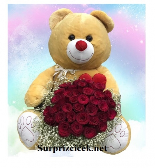 Büyük sarı ayıcık ve kucağında  51 kaliteli gül...