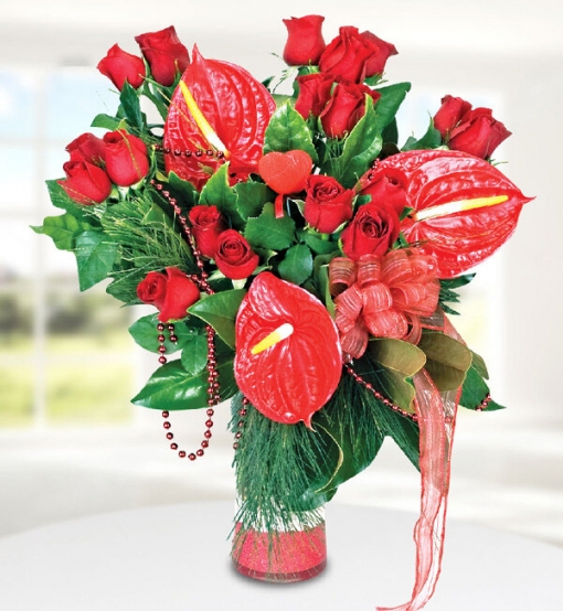 Çiçeğin kırmızı halleri gül ve antoryumla hazırlanmış görme duyusunun en şık algılamalarından birine hayat veren, vazo içindeki sunumuyla gerçek bir görsel şölen sunan karışık aranjman.