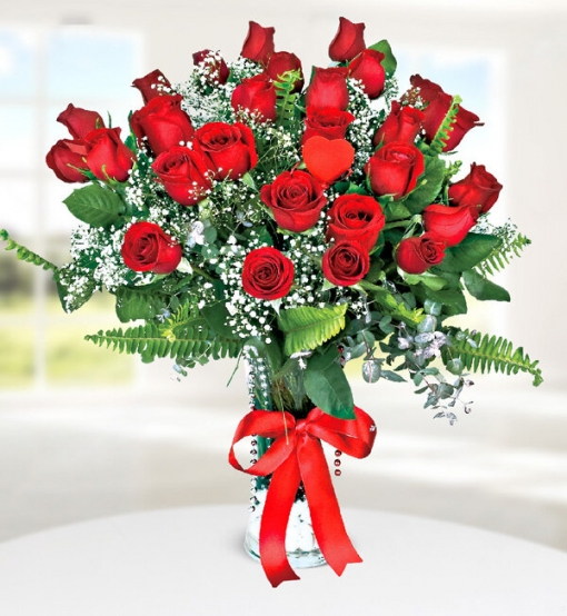 25 adet kırmızı gülün ihtişamına uyumlu bir şekilde eşlik eden yeşillikler ve cipsofilyalarla hazırlanmış çiçek siparişinde gösterişi sevenler için öncelikli tercih sebebi olabilecek vazo aranjmanı.