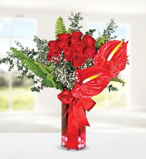 Kırmızı belki de yüzyıllardır en tehlikeli renklerden biri olarak görülmüştür. Aslında en insani duygulardan, sevginin ve aşkın ateşini en güzel şekilde yansıtan, çiçek gönderimlerinde gösterişi ve zarafeti sevenler için gül ve antoryumlarla hazırlanmış bu aranjman kırmızının bambaşka bir yorumunu yansıtıyor.