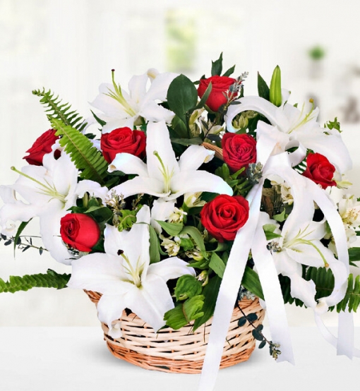 Sepette Kazablanka Lilyum Gül Bu aranjman sepet içerisinde beyaz kazablanka lilyum ve kırmızı gül ile hazırlanmıştır.