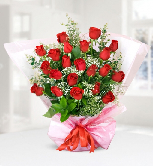 21 Kırmızı Gül Buketi Kırmızı gül, cipsofilya ve çeşitli yeşillikler ile hazırlanmış buket.