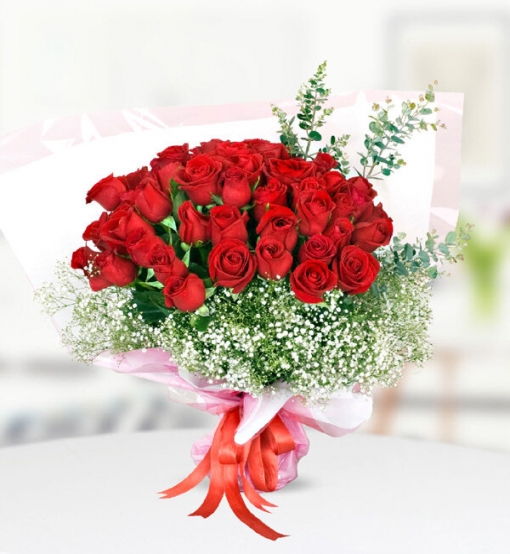 33 Kırmızı Gül Buketi Kırmızı gül, cipsofilya ve çeşitli yeşillikler ile hazırlanmış buket.