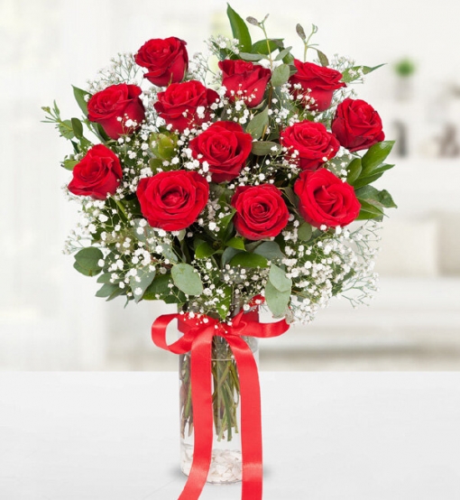 12 Kırmızı Gül Vazosu Cam vazo içerisinde kırmızı gül, cipsofilya ve yeşillikler ile hazırlanmıştır.