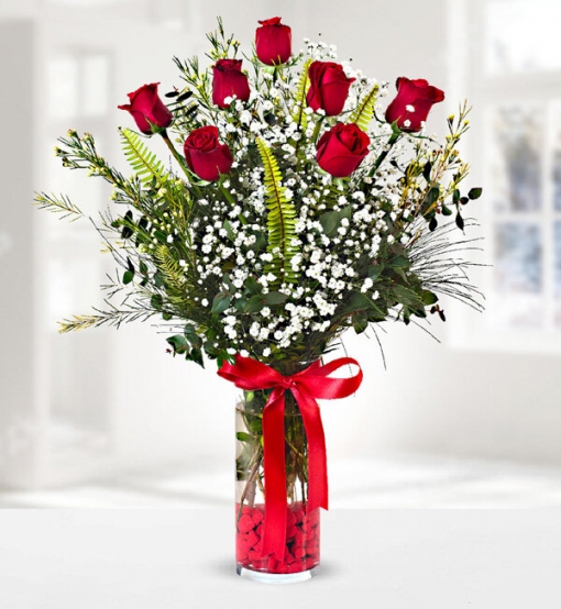 Vazoda 7 Kırmızı Gül Silindir cam vazo içerisinde kırmızı gül, cipsofilya ve yeşillikler ile hazırlanmıştır.