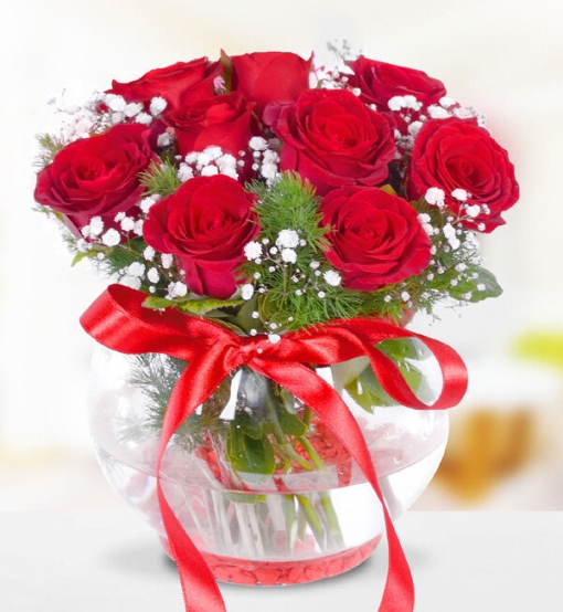 9 Kırmızı Gül Akvaryumu Fanus cam vazo içerisinde kırmızı gül, cipsofilya ve yeşillikler ile hazırlanmıştır.