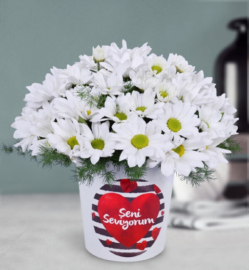 Beyaz Papatya Aranjmanı Seni seviyorum temalı seramik vazo içerisinde beyaz papatya ve yeşillikler ile hazırlanmıştır.