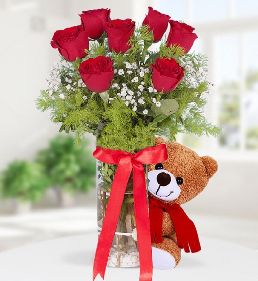 Vazoda 7 Kırmızı Gül Ayıcık Silindir cam vazo içerisinde kırmızı gül, peluş oyuncak, cipsofilya ve yeşillikler ile hazırlanmıştır.